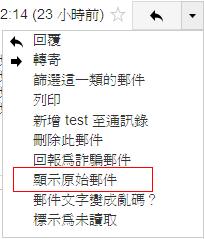 在郵件列表點選該信按滑鼠右鍵 -> 內容 -> 詳細資料 -> 郵件原始檔