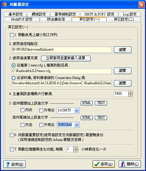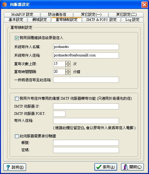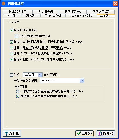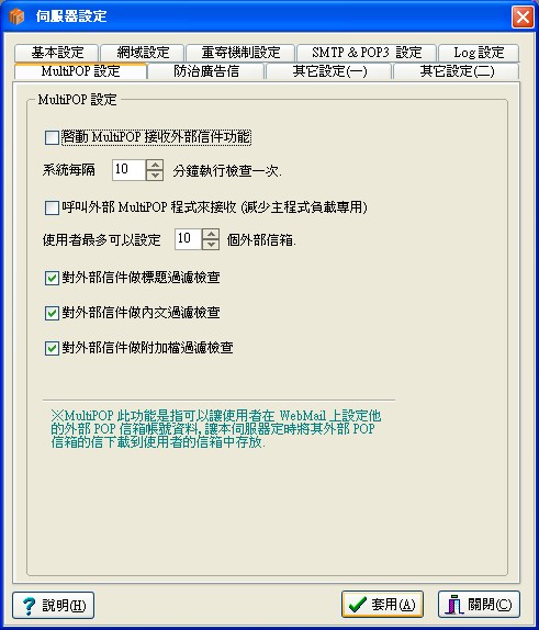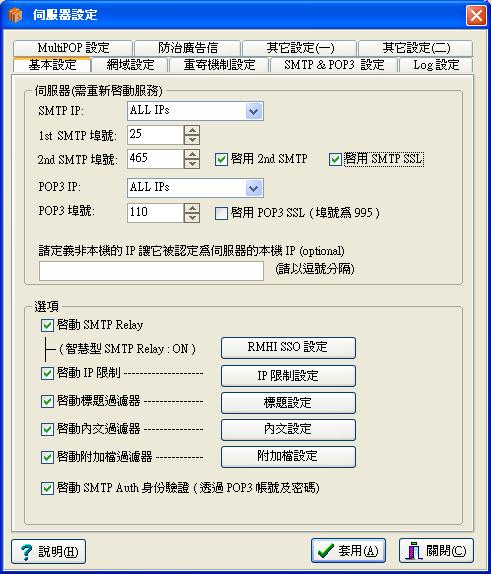 這裡有八大部份. 分別為基本設定, 網域設定, 重寄機制設定, SMTP & POP3 限制設定, LOG 設定, MultiPOP 設定, 防治廣告信設定, 其它設定.