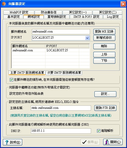 這個是可以讓你填入你想要使用的 DNS Server 來供你郵件伺服器在寄信時可以用來查詢收信人的網域資料. 你可填入你所想用的 DNS , 以期讓伺服器有較好的寄信效率, 若你真的不知該填什麼 IP, 請把它留空白, 系統會使用預設值 ( 168.95.1.1, dns.hinet.net ) 來進行工作.