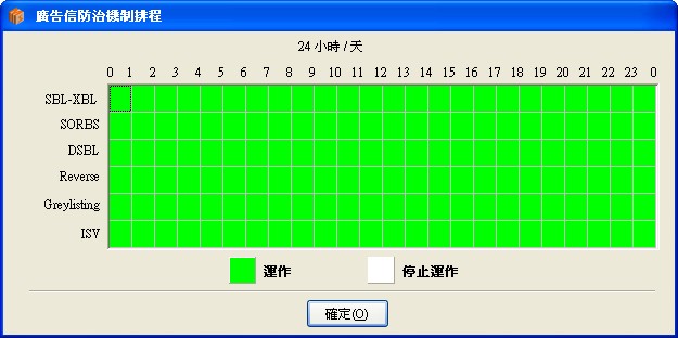 你可以在此設定各項防治措施運作的時段, 來針對您的需求進行調整. 譬如: SBL-XBL 全天候運作, 反查機制只運作凌晨至早上八點, Greylisting 運作整個白天時段..等.