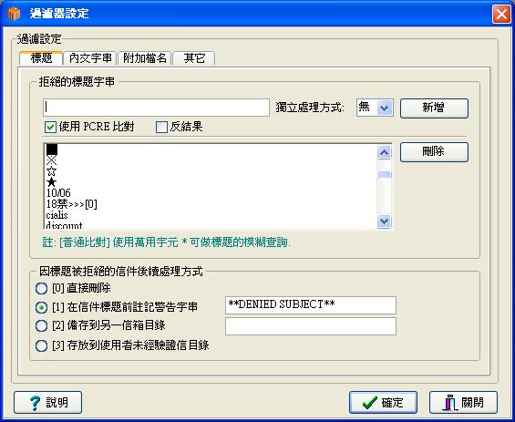 - [1] 在信件標題前註記警告字串: 只在標題前加個文字, 信件照樣存到信箱