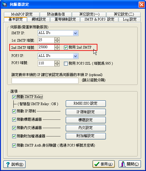 再來打開雷電MAILD. 點 [伺服器設定]->[基本設定] ->[伺服器] 將 2nd SMTP 的埠號設為 25000, 並打勾啟用它.