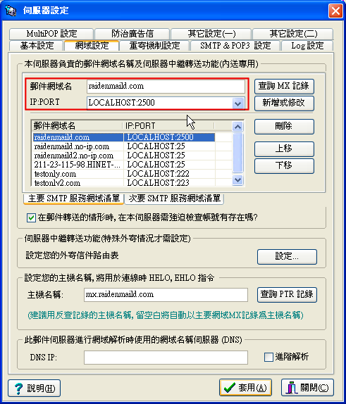 點 [網域設定] 頁面, 在 [主要 SMTP 網域服務清單] 新增或修改你的網域的 IP:PORT 為 LOCALHOST:2500 (導到 NAVGW).