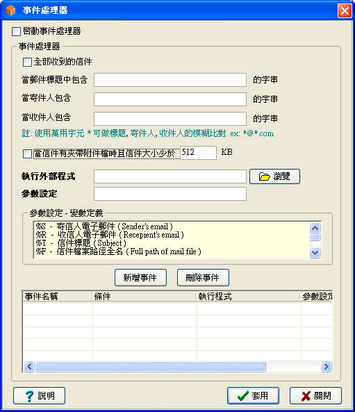 輸入完畢後就可以按 [新增事件] 給予個名稱, 並在列表中將剛剛加入的事件打勾來啟用它.