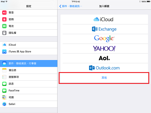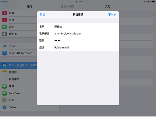 以下用圖解說明如何設定 Apple 手機的 POP 郵件帳號, 此範例用的是 iOS 8.0 的 ipad2 .