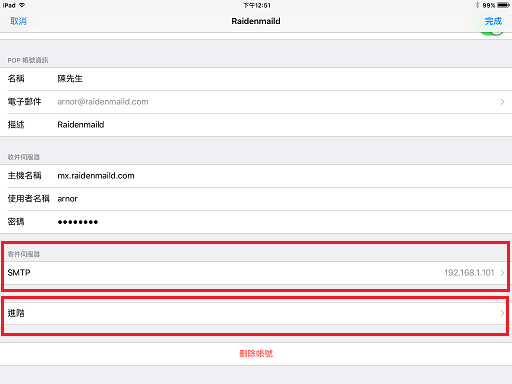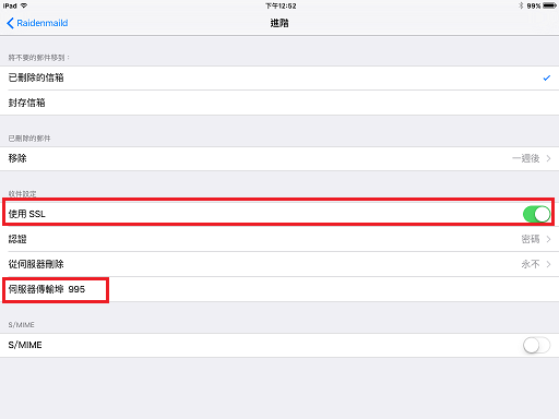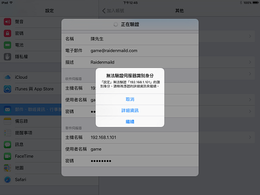 7. 上個步驟若遇到無法連線並不礙事, 因為 iOS 系統預設就是以 SSL 服務為連接的設定, 所以當它跑很久最後跳出無法連線錯誤後, 你就進到這步驟來把相對應的 SSL 選項把它們關閉就可以了.