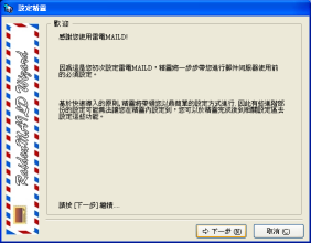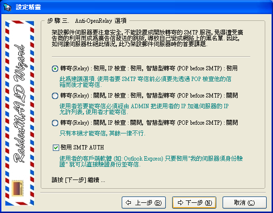 此頁面讓您設定轉寄的相關設定, 預設選項幫您啟用了智慧型轉寄 (POP before SMTP) 功能及SMTP身份驗證的功能, 此為建議選項. 按 [下一步] 繼續.