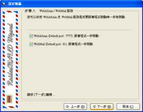 設定遠端控制台及Webmail 服務啟動方式後按 [下一步] 繼續.