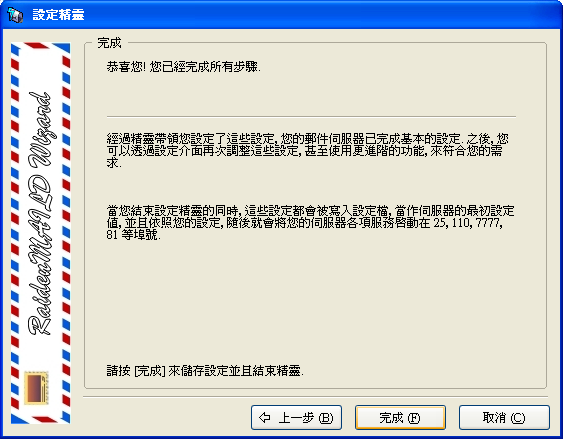 到此階段就已完成您的郵件伺服器主要設定了, 確認資料都無誤後就可以按 [完成] 來結束精靈, 開始來使用雷電MAILD了.