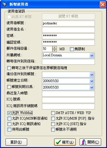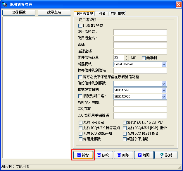 點下方的 [新增] 來新增使用者, 建議一開始就把 postmaster 這個 RFC 規定的帳號建起來當自己系統的寄信員, 之後再建立您要的帳號. 至此, 您的郵件伺服器已大功告成了. 恭喜.